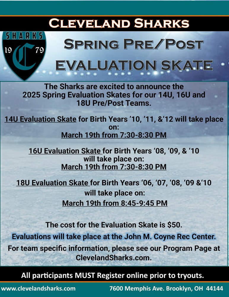 2025 Sharks' Spring Pre/Post Registration for Evaluation Skates Now Open!