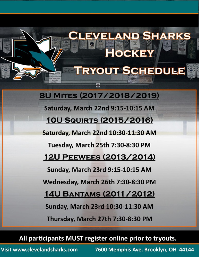 Registrations for Cleveland Sharks' Hockey Teams (8U, 10U, 12U, and 14U) are now open! All tryouts will take place the John M. Coyne Ice Rink in Brooklyn, Ohio. For more information or to register, please visit our registration page located here.