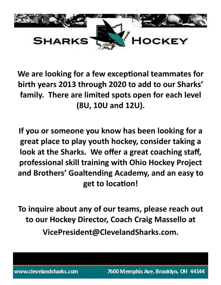 Cleveland Sharks Hockey has a Few Spots Open for our 8U-12U Teams!